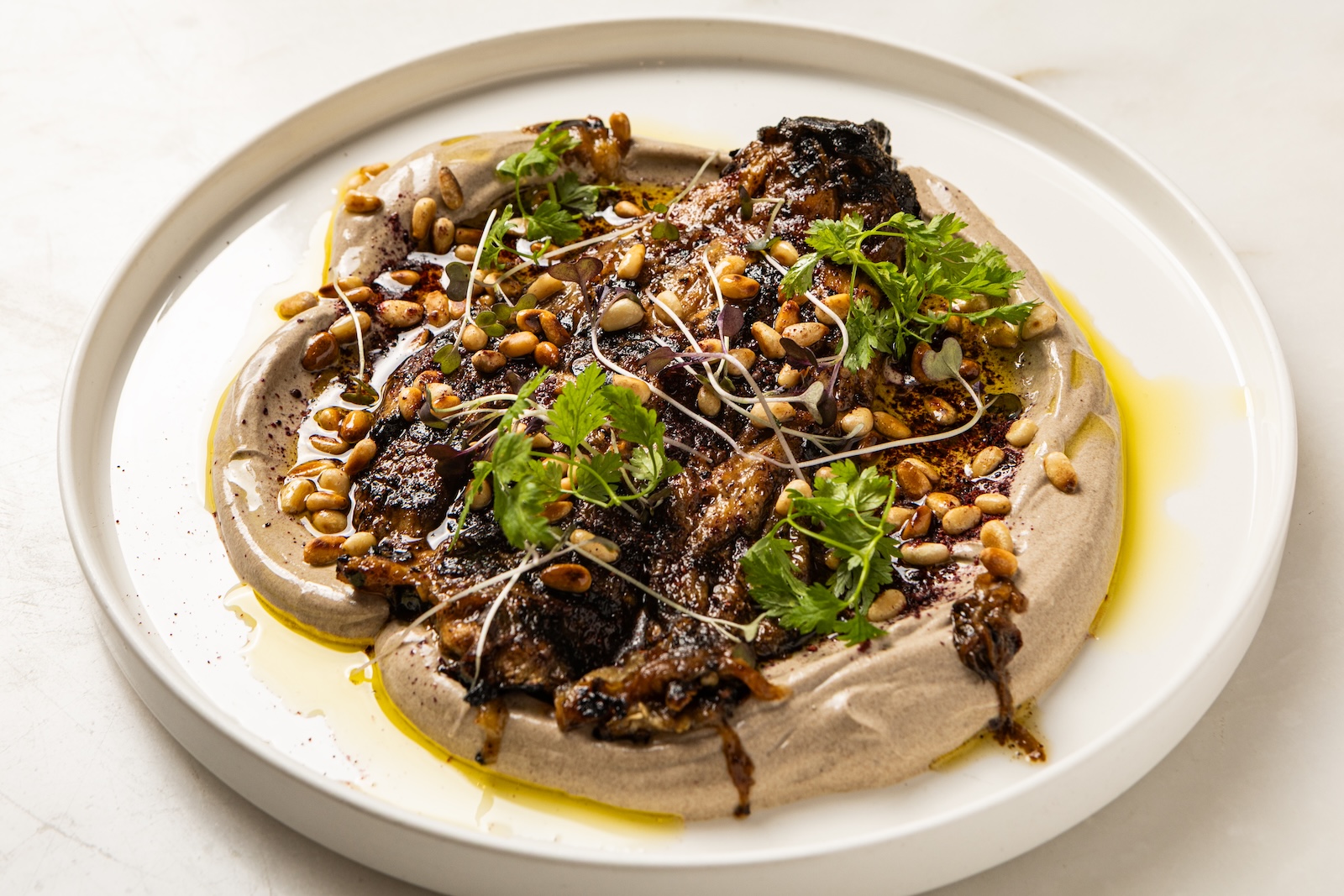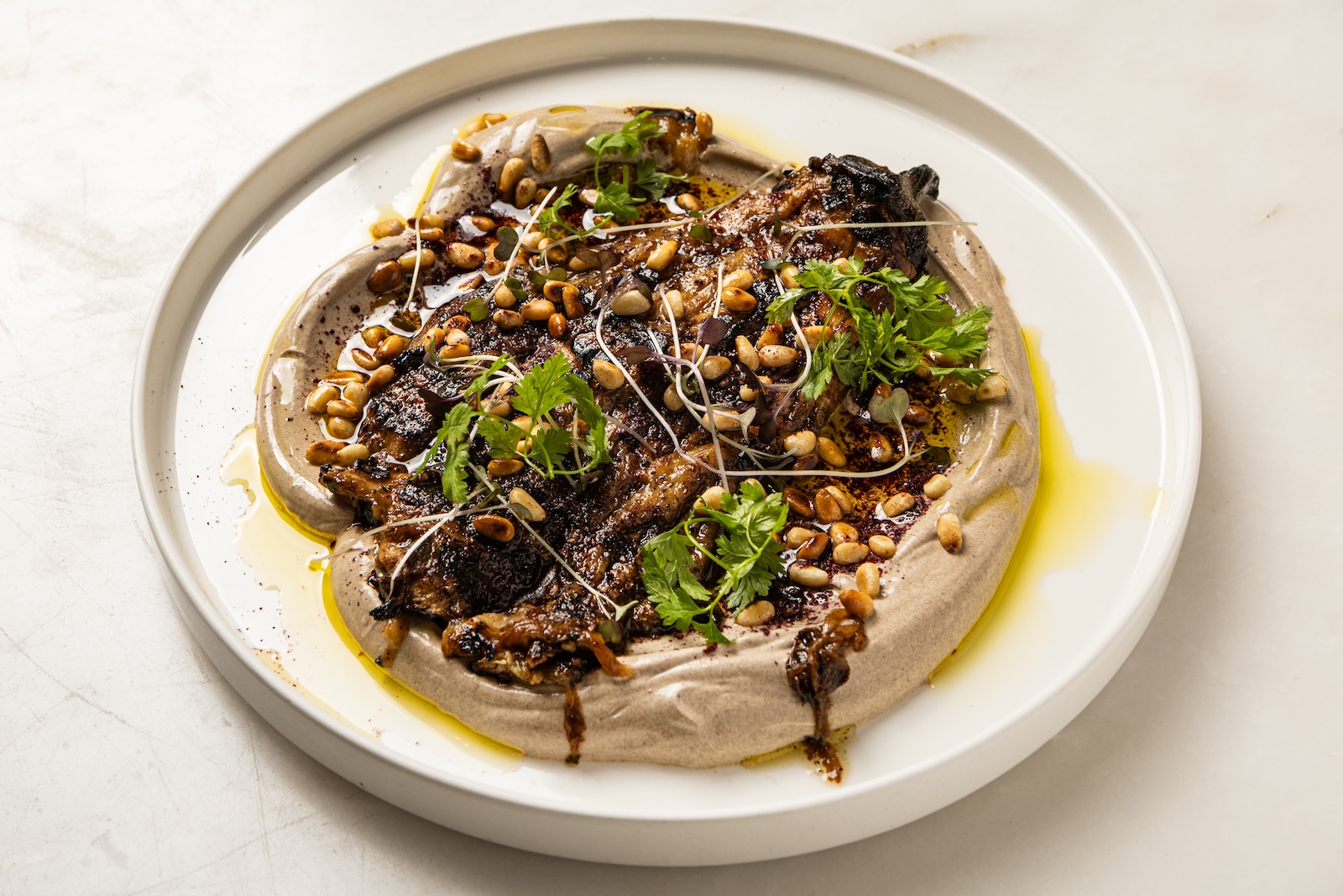 Μια ωδή στις γήινες γεύσεις, όπου η ψητή μελιτζάνα μεταμορφώνεται μέσα από το διαδοχικό γλασάρισμα με καμένο βούτυρο και μίσο. Η βαθιά γλυκάδα της συναντά τη μεταξένια υφή ενός γιαουρτιού αρωματισμένου με μαύρο σκόρδο, δημιουργώντας ένα παιχνίδι εντάσεων και αντιθέσεων. Το καβουρδισμένο κουκουνάρι και ο φρέσκος βασιλικός δίνουν την απαραίτητη ένταση και φρεσκάδα σε μια δημιουργία που επαναπροσδιορίζει την ταπεινή μελιτζάνα σε ένα πιάτο υψηλής γαστρονομίας.