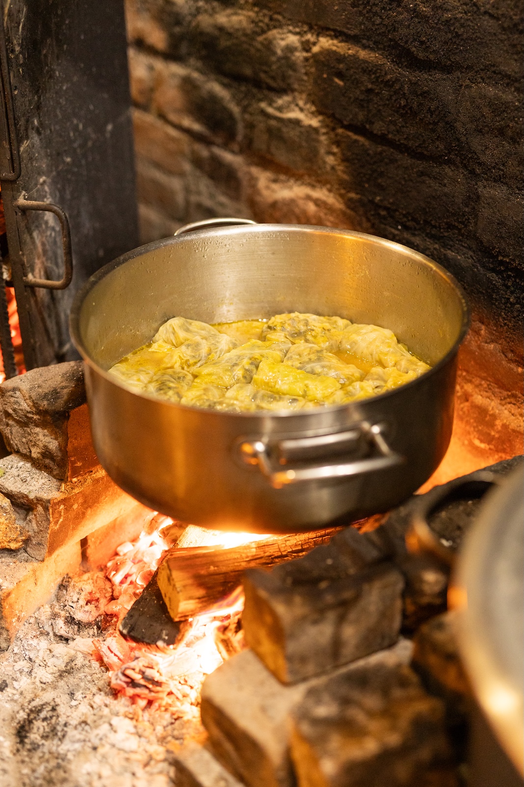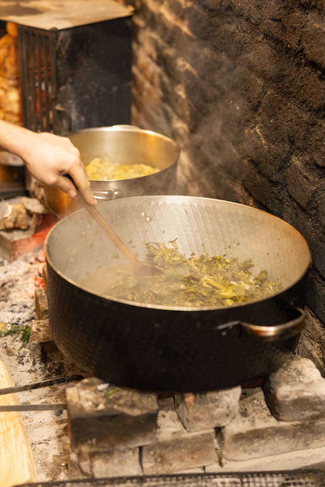 Το φαγητό ξεκινάει πάνω σε ανοιχτή φωτιά. Τα χόρτα βγάζουν τα αρώματά τους και δημιουργείται η βάση της γεύσης με τον παραδοσιακό τρόπο, κατευθείαν πάνω στη φλόγα.